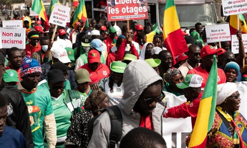 Carrying placards and waving Senegalese flags, demonstrators chanted “Free the hostages” as they marched through parts of the capital in a show of solidarity with the detained fans.