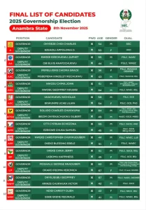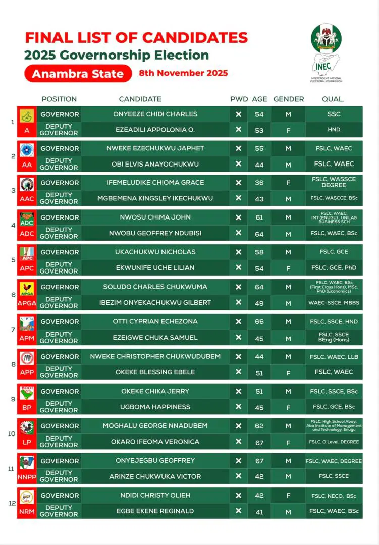 The Independent National Electoral Commission (INEC) has officially published the definitive list of 16 candidates for the Anambra State governorship election scheduled for November 8, 2025. The commission also announced that campaign activities will commence on June 11.