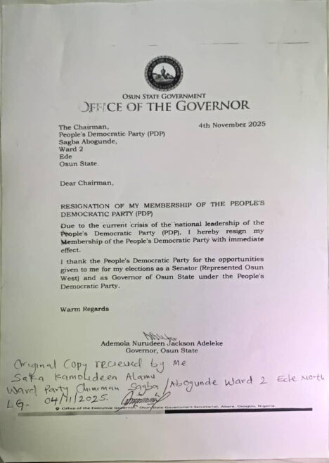 The statement reads, “Governor Ademola Adeleke of Osun State has resigned his membership of the People’s Democratic Party (PDP) since November 4th, 2025.